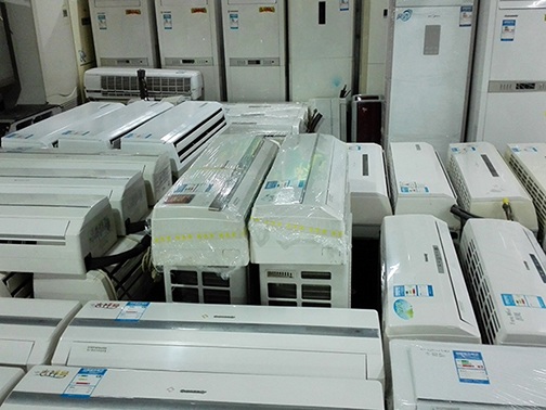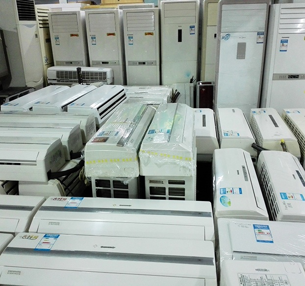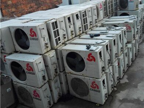 廢空調(diào)的室外機(jī)(手工拆解程序):卸下塑料外殼 → 粉碎 分選 洗凈再利用,制冷佛里昂與冷凍機(jī)油(兩者混在一起)的回收 佛里昂→ 佛里昂處理設(shè)備 → 蛍石、氯化鈣、水(分離) → 或其它外部處理設(shè)備(水泥窯等)